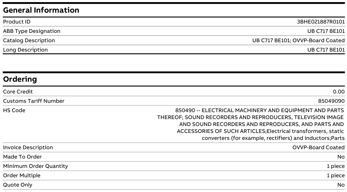 ABB 3BHE021887R0101 UBC717BE101 is a specialized, coated PCB designed and manufactured by ABB for the industrial automation, power and drive product lines. The product is clearly labeled as "OVVP-Board Coated", where "Coated" indicates that a layer of Conformal Coating has been applied to the surface of the circuit board. This coating is typically a transparent polymer film used to seal and protect the electronic components on the circuit board, protecting them from moisture, dust, chemical pollutants, salt fog, and mold. Therefore, 3BHE021887R0101 is not an independent functional module or end product, but rather as a core spare part or sub-component, integrated within ABB's more complex electrical equipment. This ensures the long-term reliable operation of the host equipment in harsh industrial environments.