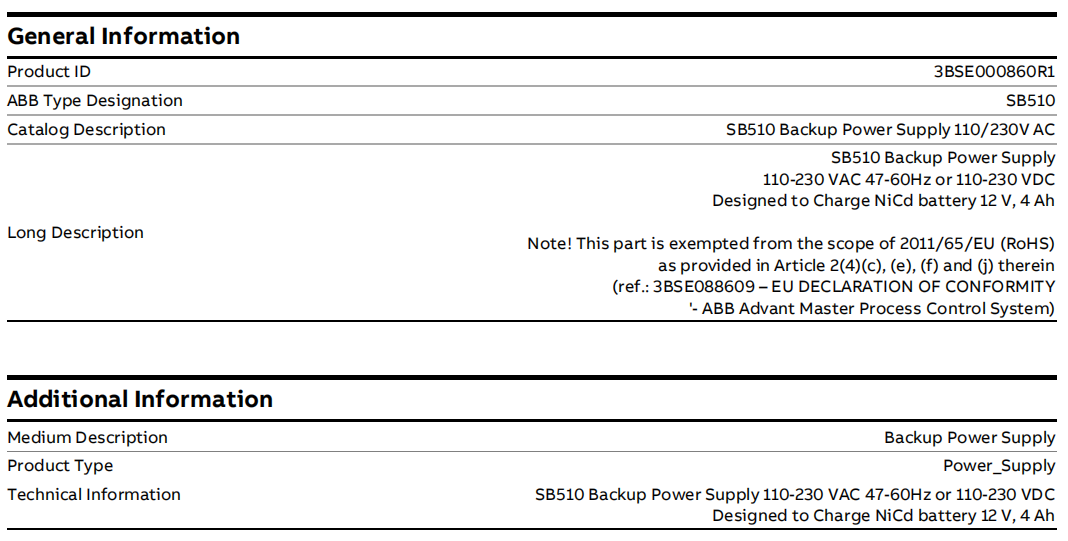 SB510 is a key backup power component in the ABB Advant Master distributed process control system. 3BSE000860R1 is defined as Backup Power Supply. The core function is to provide a brief but crucial DC power supply to the critical memory in the Advant Master system when the main AC power supply fails or is interrupted, in order to prevent program loss and critical data caused by sudden power outages.
