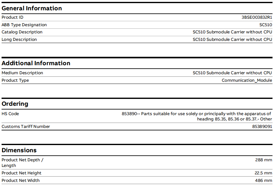 ABB SC510 is a key hardware expansion platform in the Advant Master distributed process control system. 3BSE003832R1 is defined as a Submodule Carrier without CPU. The core function is to serve as a carrier of physical and electrical interfaces for installing and carrying various functional communication submodules.