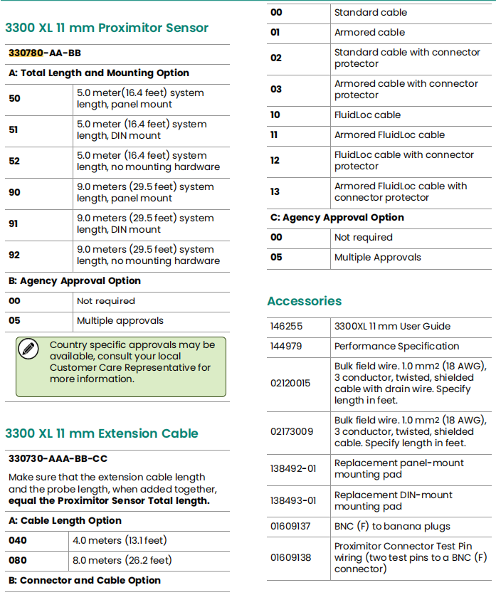 Upgrades and Replacements: This sensor replaces existing 7200 Series 11 mm and 14 mm sensor systems. Upgrading from the 7200 Series requires replacing all components (probes, extension cables, and proximity sensors) with 11 mm 3300 XL components and upgrading the corresponding monitoring system.