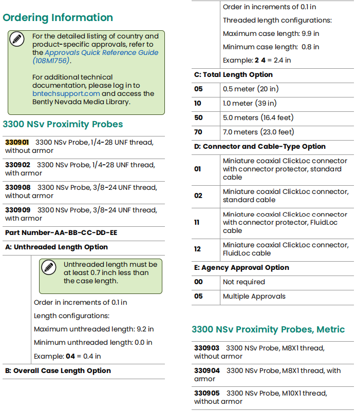 Compatible with 3300 RAM Systems: The 3300 NSv probe (including this model) is mechanically and electrically compatible and interchangeable with the probes and extension cables of Bently Nevada's previous 3300 RAM systems. When upgrading from a 3300 RAM system to a 3300 XL NSv system, the existing probe and extension cable can continue to be used.