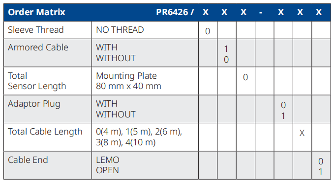 PR6426/010-110 is an eddy current sensor with a probe diameter of 32mm. The huge probe size enables it to generate a deeper and broader induction field, thus allowing for the measurement of targets at greater distances and being insensitive to minor unevenness on the surface being measured.