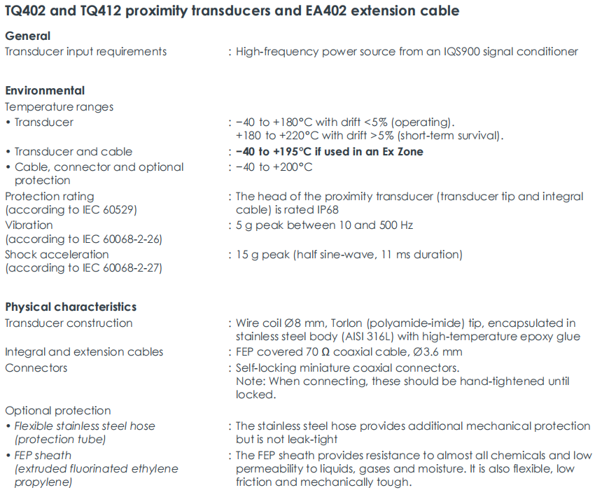 TQ412 111-412-000-013-A1-B1-E050-F2-G050-H05 is a high-performance, non-contact eddy current displacement sensor produced by Parker Meggitt. The TQ412 product belongs to the close measurement system product line and is specifically designed for precisely measuring the relative vibration and axial displacement of rotating mechanical shafts in harsh industrial environments.