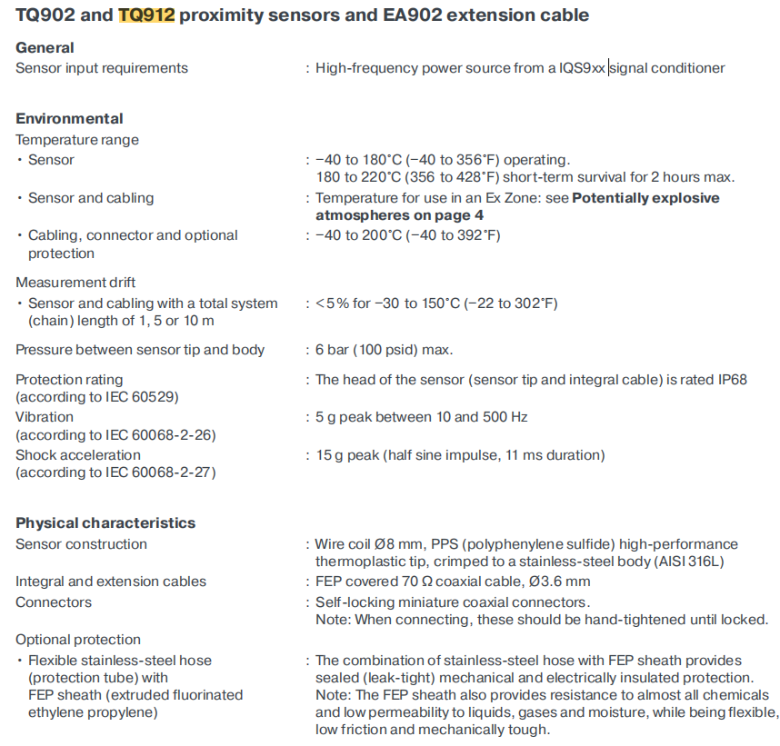 The TQ912 is a high-performance, non-contact proximity sensor in the Vibra-Meter ® product line of Parker Meggitt, specifically designed for reverse-mounted applications. It operates based on the eddy current principle and is used to precisely measure the relative displacement between the sensor probe and the metal target. This sensor is usually used in combination with the EA902 extension cable and the IQS900 signal conditioner to form a complete, calibrated proximity measurement chain.