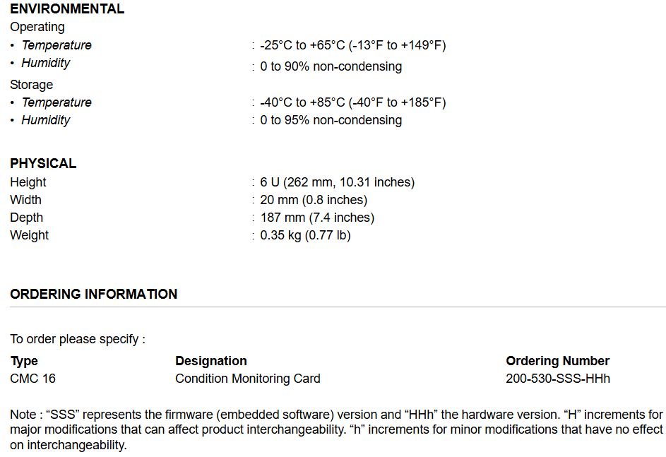 Brand: Vibro-Meter Description: Condition Monitoring Card Condition: Brand New Certificate: COO TEST REPORT WARRANTY LETTER Warranty: 1 year Inventory Qty: 5 Payment Term: T/T Shipping Port: Xiamen The Vibro-Meter CMC16 is a high-performance and intelligent front-end data acquisition unit designed by Swiss Vibro-Meter SA for its flagship VM600 series of condition monitoring systems. In model 200-530-025-014, 025 represents the embedded software version and 014 represents the hardware version.
